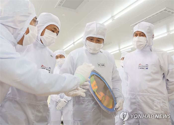 추경호 부총리, SK하이닉스 이천사업장 방문 (서울=연합뉴스) 추경호 경제부총리 겸 기획재정부 장관이 27일 경기 이천시 SK하이닉스 이천사업장을 방문, 반도체 생산 현장을 둘러보며 관계자의 설명을 듣고 있다. 2023.9.27 [기획재정부 제공. 재판매 및 DB 금지] photo@yna.co.kr