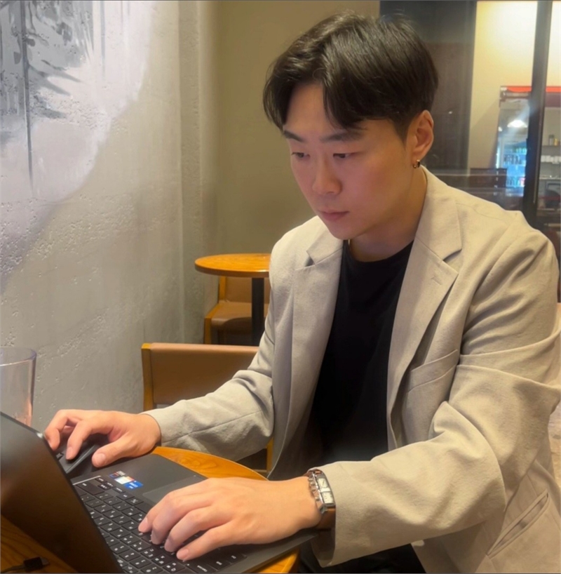 노트북을 펴고 업무에 몰두하고 있는 (주)아이디어 오션 김중호대표
