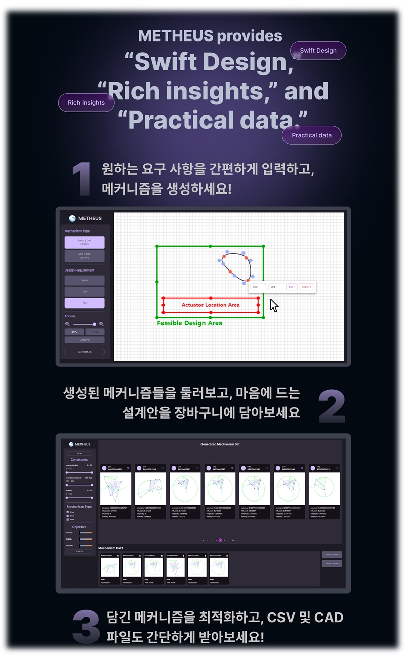 METHEUS는 저희의 핵심 기술인 SBM을 기반으로 표준화된 빅데이터를 생성하고, 이를 통해 AI 학습을 바탕으로 사용자가 원하는 메커니즘 후보를 자동으로 도출하는 기능을 목표로 개발 중입니다. 다양한 설계 요구에 맞춘 창의적인 메커니즘을 신속하게 생성할 수 있는 가능성을 가지고 있습니다.