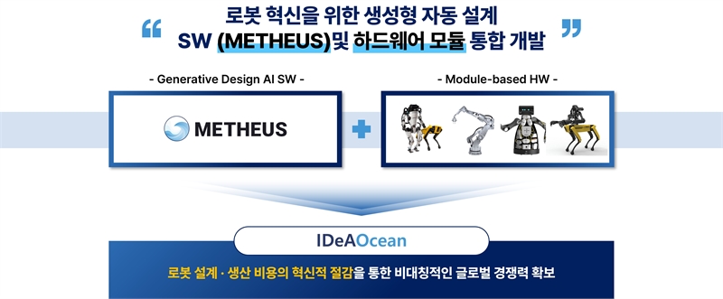 아이디어오션은 이러한 제어 중심의 접근과 달리, METHEUS를 활용해 하드웨어 설계 자체에 AI 기술을 결합하는 새로운 프로젝트를 진행 중입니다. METHEUS는 AI 기반의 생성형 설계를 통해 로봇의 핵심 메커니즘을 자동으로 설계하고, 각 로봇이 수행해야 할 과업에 최적화된 하드웨어를 개발하는 데 중점을 둡니다. 이를 통해 기존의 범용 로봇이 아닌, 각 과업에 맞춤화된 특화형 로봇을 개발하여 로봇의 성능과 효율성을 극대화하는 것이 목표입니다.
