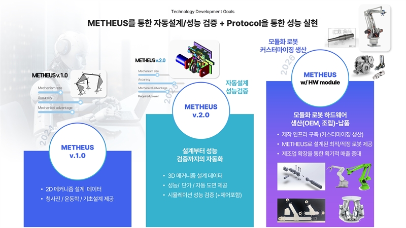 특히 로봇, 차세대 모빌리티분야 뿐만 아니라 우주항공, 의료 기기와 같은 산업에서도 기계 설계 자동화는 혁신을 주도할 것입니다. 복잡하고 정밀한 설계를 요구하는 이들 분야에서는 자동화가 설계 품질을 높이고, 더 빠르고 효율적인 생산을 가능하게 합니다. 저희가 개발 중인 METHEUS v.2와 같은 솔루션은 이러한 변화를 가속화하여, 다양한 기업들이 효율적이고 비용 효과적인 설계 프로세스를 도입할 수 있도록 도울 것입니다